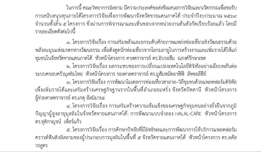 5 มิถุนายน 2568 ผู้ช่วยศาสตราจารย์ ดร.สุไม บิลไบ อาจารย์ประจำสาขาวิชาการสอนอิสลามศึกษา คณะวิทยาการอิสลาม มหาวิทยาลัยสงขลานครินทร์ วิทยาเขตปัตตานี ในฐานะหัวหน้าโครงการวิจัย เรื่อง “การจัดการเรียนรู้ด้วยกระบวนการคิดเชิงออกแบบเพื่อพัฒนาทักษะการคิดเชิงนวัตกร