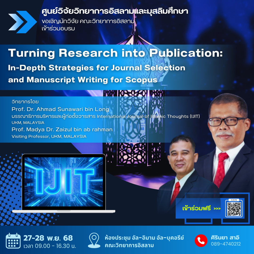 ศูนย์วิจัยวิทยาการอิสลามและมุสลิมศึกษา คณะวิทยาการอิสลาม ขอเชิญนักวิจัยคณะวิทยาการอิสลาม เข้าร่วมโครงการอบรมเชิงปฏิบัติการ “Turning Research into Publication: In-Depth Strategies for Journal Selection and Manuscript Writing for Scopus” ระหว่างวันที่ 27-28 พฤศจิกายน 2568 เวลา 09.00 – 16.30 น. ณ ห้องประชุมอัล–อิมาม อัล–บุคอรีย์ คณะวิทยาการอิสลาม